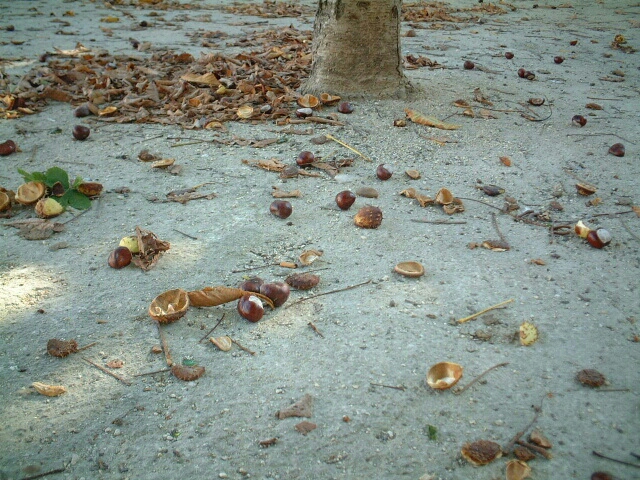 トンガリはなく、ころっとまあるいマロニエの実が落ち始める。